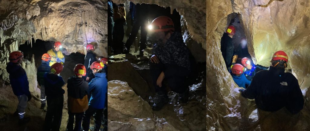 C’est au tour du premier groupe, une fois équipé et le briefing terminé, de pénétrer dans la froideur des entrailles du massif jurassien. Il ne faut pas plus d’une dizaine de mètres pour que la température ambiante ne dépasse guère les 5-6 degrés. Nous commençons par la grande cheminée située un peu en dehors du chemin principal mais qui vaut la peine d’être admirée. L’occasion également de répondre aux premières questions qui commencent à germer dans la tête de nos jeunes explorateurs.